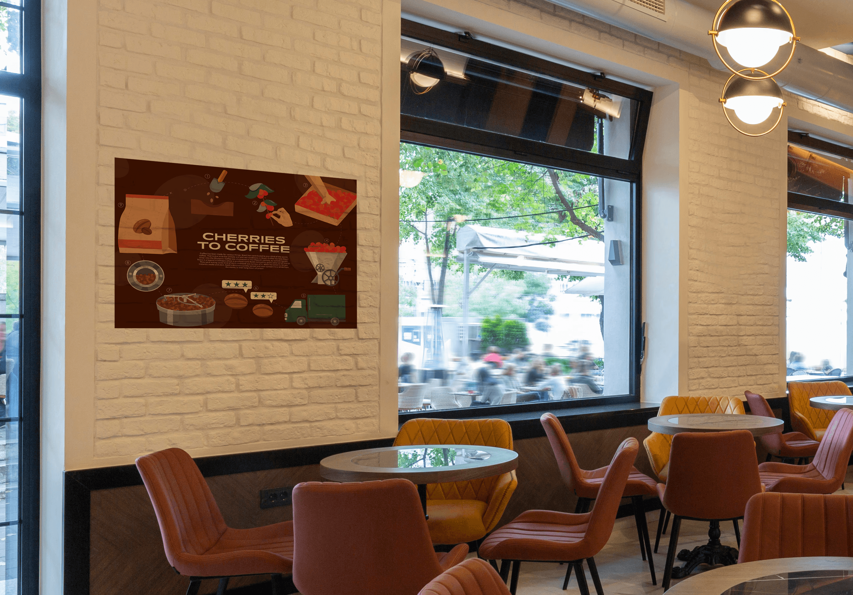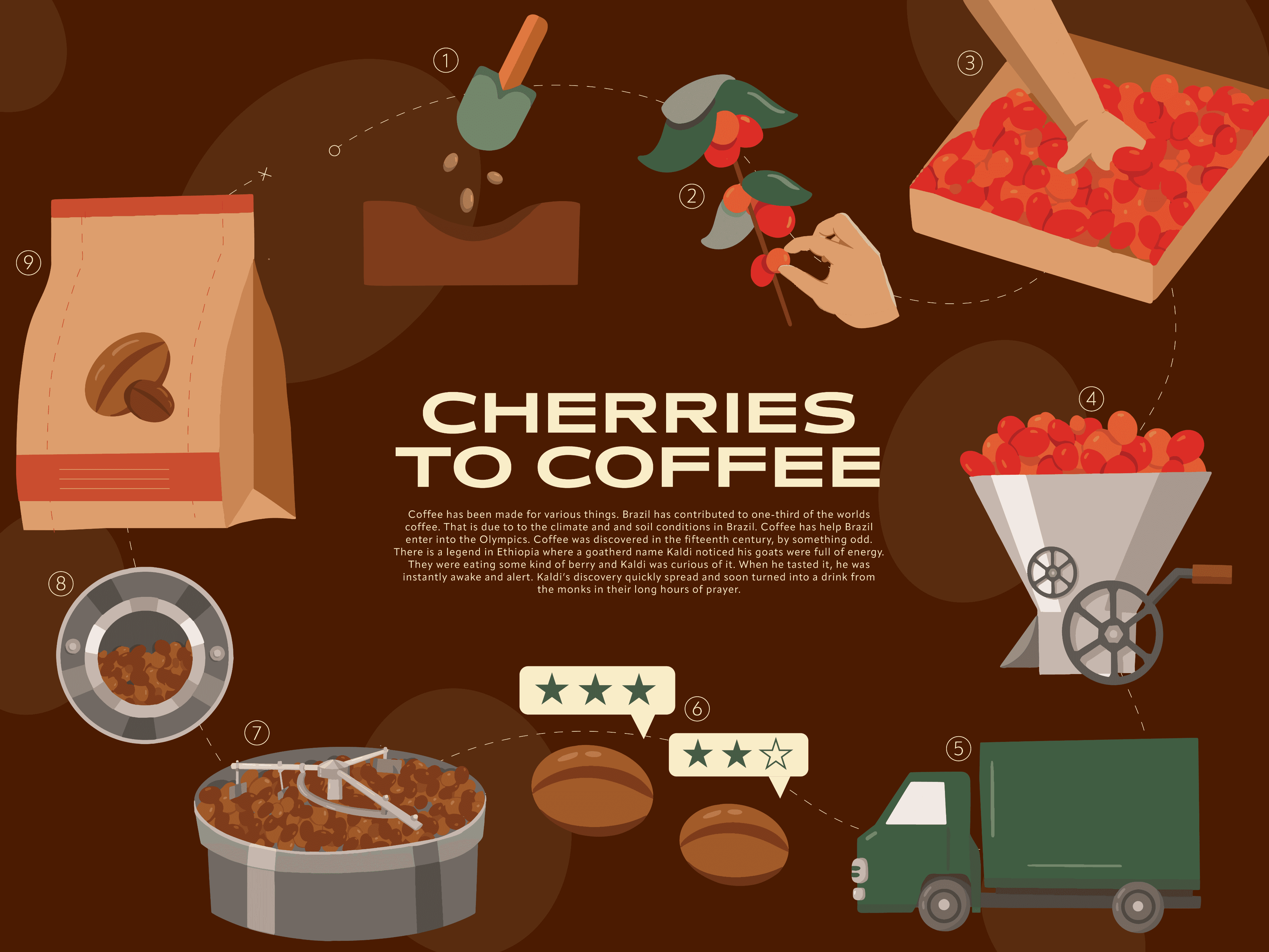 For this project, we had to choose an item, research its process, then show without text its process. Coffee can be made in many different forms, but where do the beans come from? Cherries. When imagining where this poster would go, it was clear that it needed to be in a coffee shop. It needed to be modern, clean and detailed. The colors were inspired by the warmth and flavor that